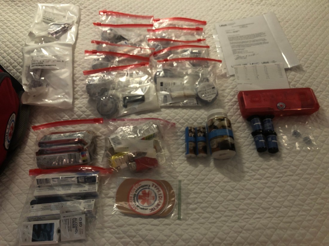 I’ve been planning this trip for so long, reading books and websites, making lists, and just daydreaming. The real work though, started this past week. Part of traveling successfully with type 1 diabetes is trying to anticipate everything you could face and then prepare for it. I’ll be on the road for 15 days. At home, that means 5 infusion site changes. So, I’m bringing 10. That’s in case every single one fails. I have a whole bottle of glucose tabs and will pick up juice boxes in each city (love trying different things like pear juice). While my dexcom would last the entire trip (I put a new one on before leaving), I brought 2 for backup and extra adhesive coverings. I have ketone strips and regular meds, cold medicine and tamiflu. I brought nuun tablets for dehydration and a fiber mix in for, well you know. I have 3 vials of insulin for my pump, 3 cartridges for my InPen (my new back up) and a pen of long acting. The InPen and long acting are for if my pump fails (which only ever happens if I’m out of the country. The insulin is in a frio bag, handy for travel and if the hotel doesn’t have a fridge. All of it fits nicely in a repurposed cooler that is pictured below. I also have a spare glucometer. Throw in a few snacks and we are all set!