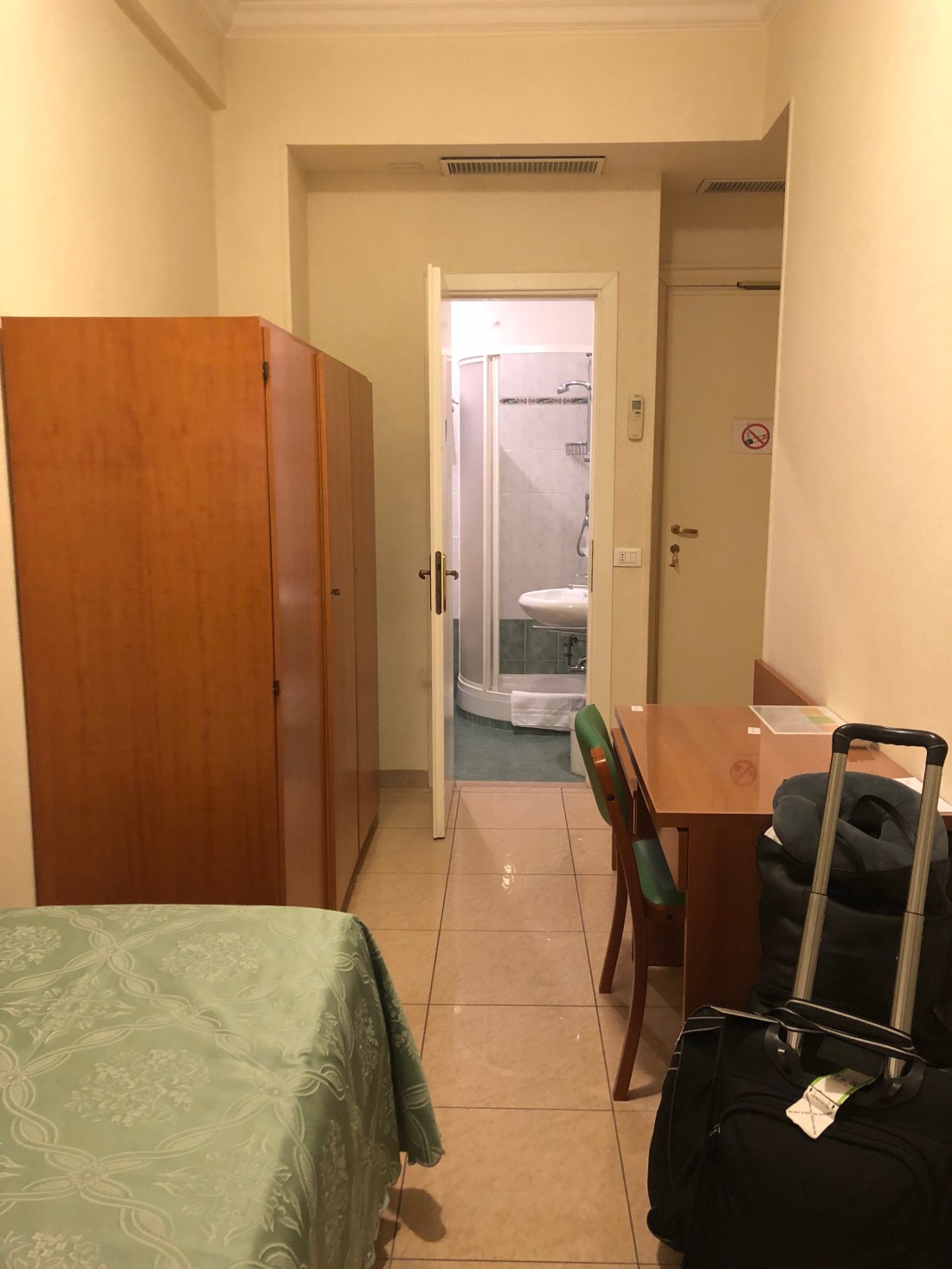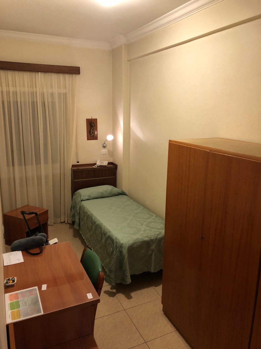 After our train stopping for an hour and a half due to fire on the tracks, I arrived in Rome around 730pm. I quickly found a taxi (taxi stands are well marked in Rome) and made my way to the convent where I would be staying. Did you know that there are certain orders of nuns that have a mission of hospitality? There are quite a few that have “bed and breakfast” type hotels to encourage people to come to Rome. They are very inexpensive to stay at and the care and attention you receive is unparalleled. You have to sacrifice a little…..watching tv in a communal room instead of your room. They have great WiFi. My Sisters, whose mother House is in Madrid, we’re mostly from Puerto Rico and a few had even lived in Miami. I really can’t tell you just how loving and helpful they were. I will definitely visit again. Here are pictures of my room.