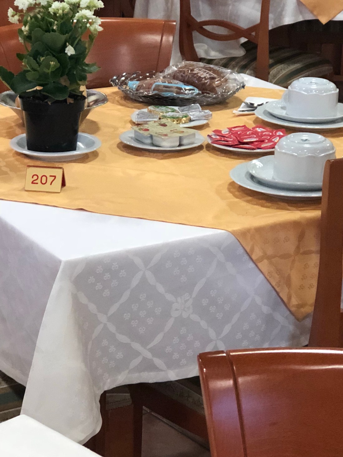 Each morning, when you enter the breakfast dining room, there is a table with your room number. It’s already set with dishes, coffee cup bread basket (sweet croissant and hard roll). On the buffet was fruit, yogurt, cereal, juices, tomatoes, coffee and tea. More than enough to get you going for a day of touring. In the background there is a tv softly playing Christian 🎶 music. There were families from Spain and France visiting while I was there.