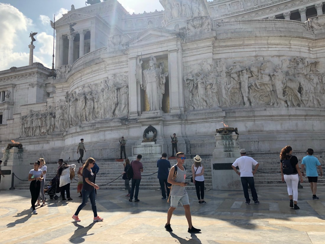 For my first full day I had booked two experiences. The first of which was “Must have pictures of Rome and walk tour”. Renato gave the tour and he was very knowledgeable. He is a professional photographer as well and took pictures of me and the other gentleman on the trip. This was a great bonus for someone traveling alone. Back to the tour…. we met at Piazza Campidoglio, where he explained the history of each of the buildings and showed us how each was from a different period in the history of Rome. I especially liked hearing about the recycling of the columns inside the church. Each pair was from someplace different. We also visited the ruins behind the government building and the monument to the unknown soldier. Continued below the pictures…