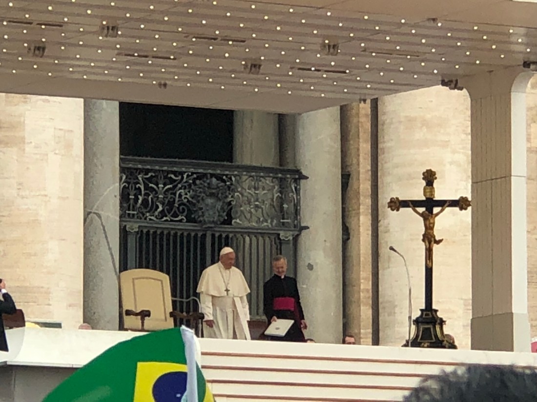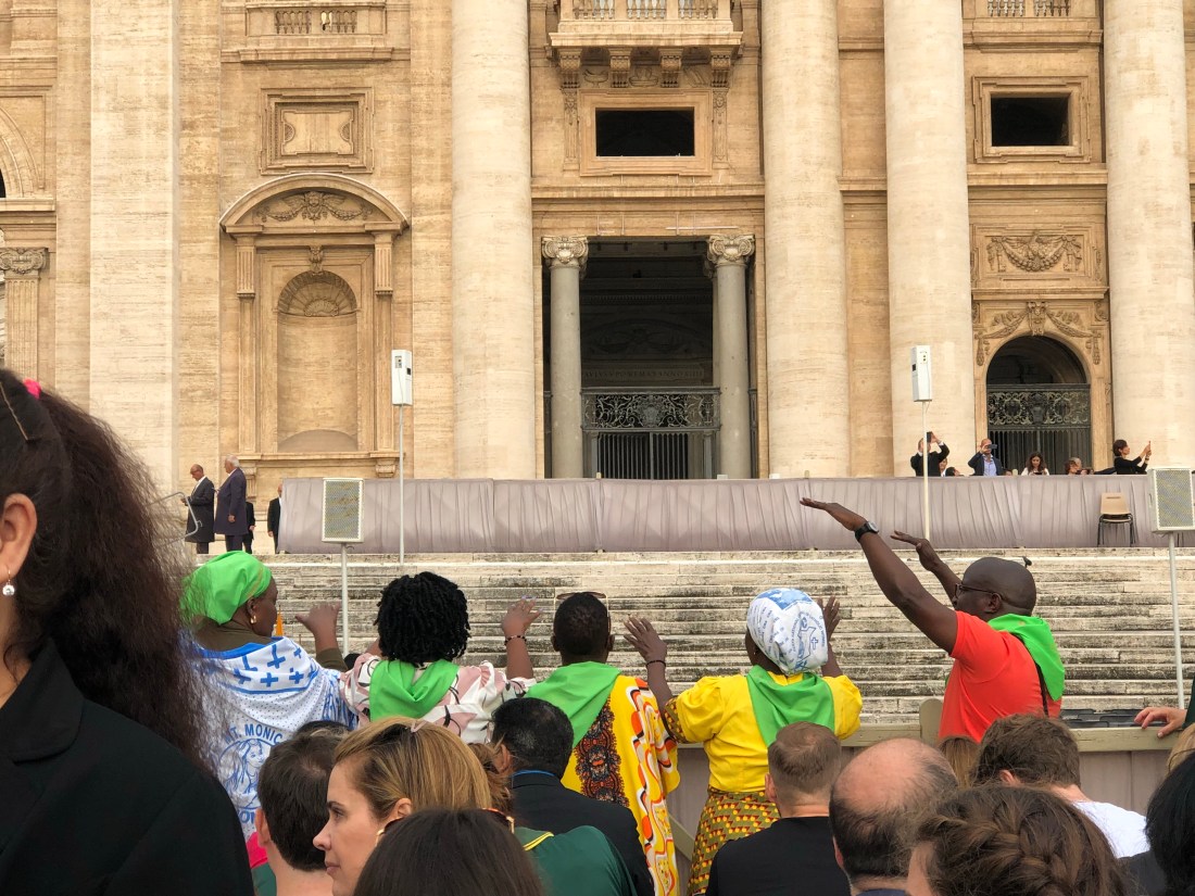 Their group aimed for a certain spot and , not knowing any better, I aimed for the front and found a seat in The eighth row. I found out later that you should head for the sides or corners and near babies if you want to see him up close as he rides around the crowd. But if I had done that, I would have missed a lot! There were groups from all over the world and I felt that, for just a moment, we were all at peace and one with another. It was as it should always be. Joy filled everyone’s face. In the very front was a group from Kenya. They were singing and dancing. Their exuberance was such that they were video taped. All I know is that they were making all of us smile! To the right of them was a group from Guadalajara. I saw people from Poland, Germany, Ivory Coast, Brazil, Argentina, Australia and many more.
