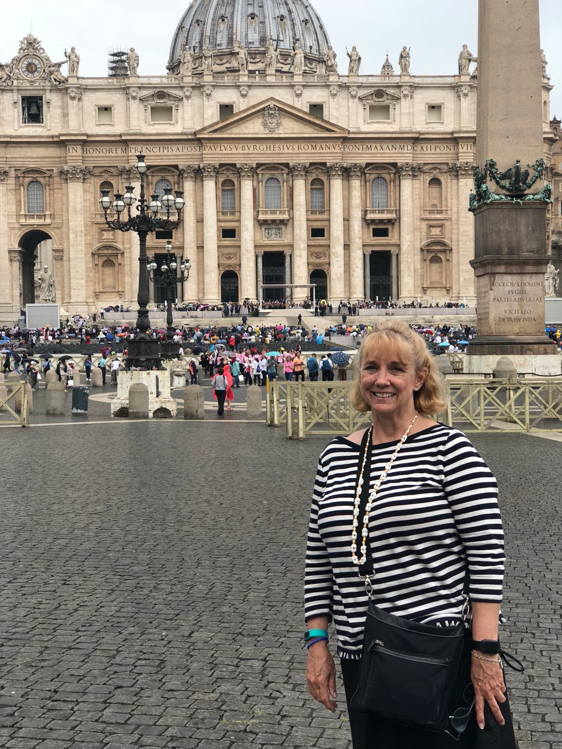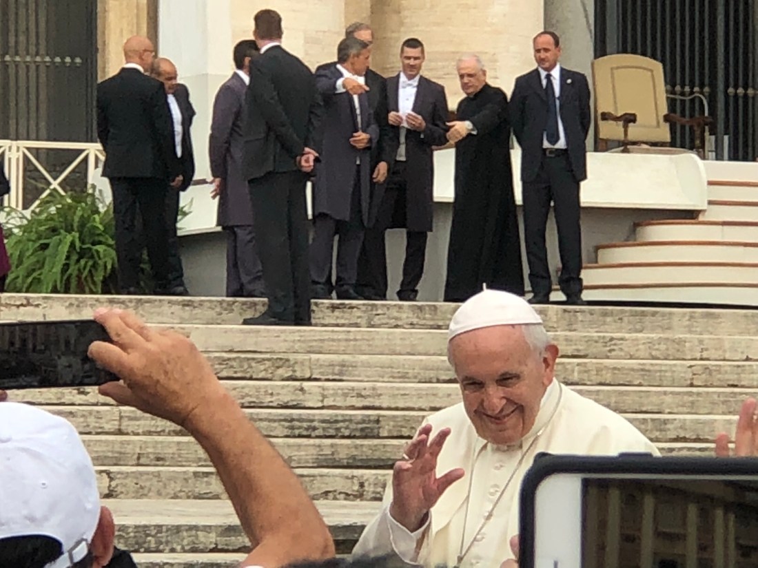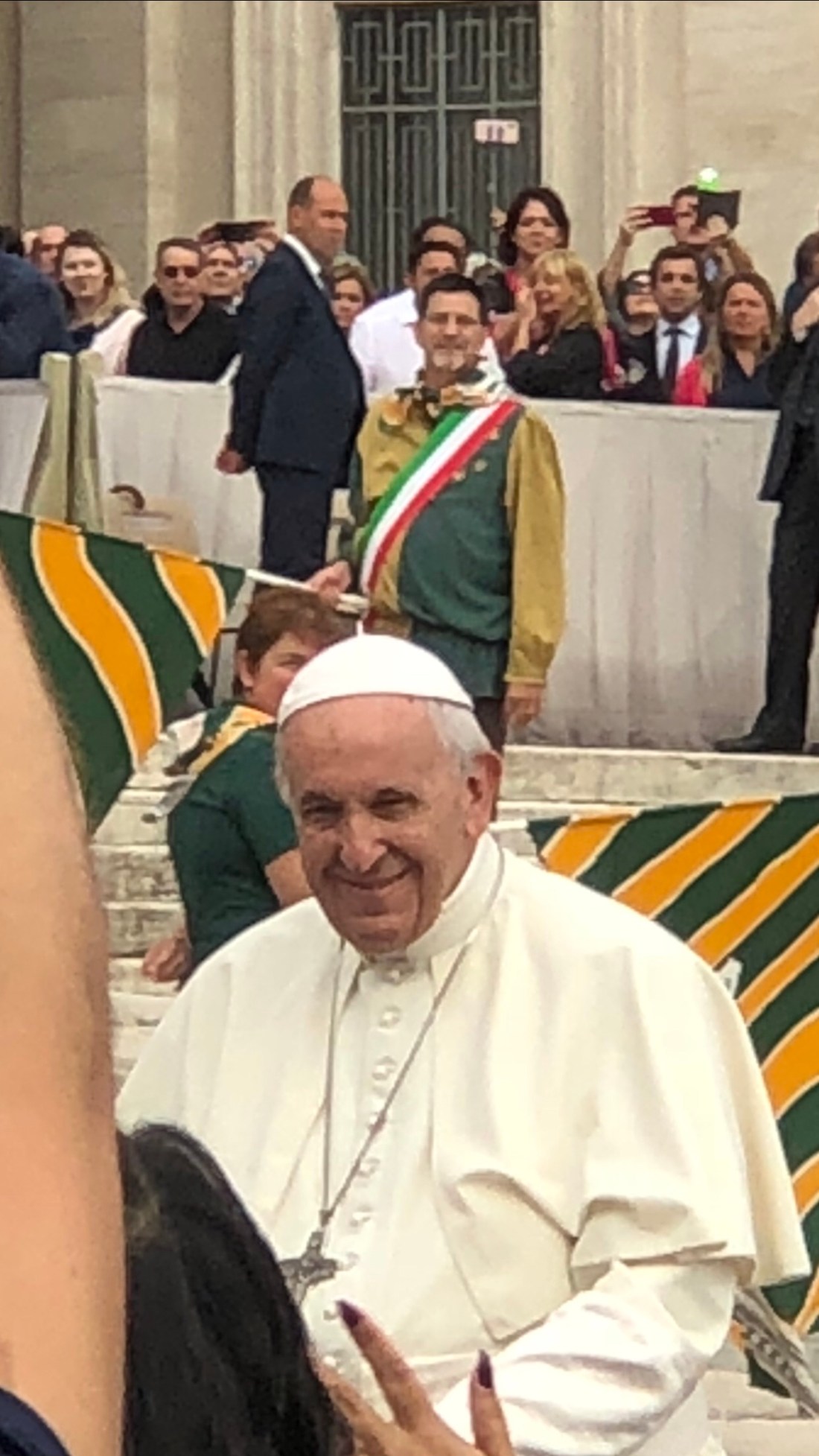 After 5 hours of sleep (I was excited), I rose early for the Audience with the Pope. If you’re new to my blog, the Sisters gave me a ticket. Sister had told me that I needed to leave at 7-730 in order to get a good seat. There was a crowd going through security, of course. In the craziness, I saw familiar colored fabrics of my Tahitian friend’s that I had met in Lourdes, France. I made my way to them and held up the picture I had taken. The lady made a huge smile, we took a selfie, and then she took off a strand of her seashells (lei) and put them around my neck . I was so touched and will treasure them forever.