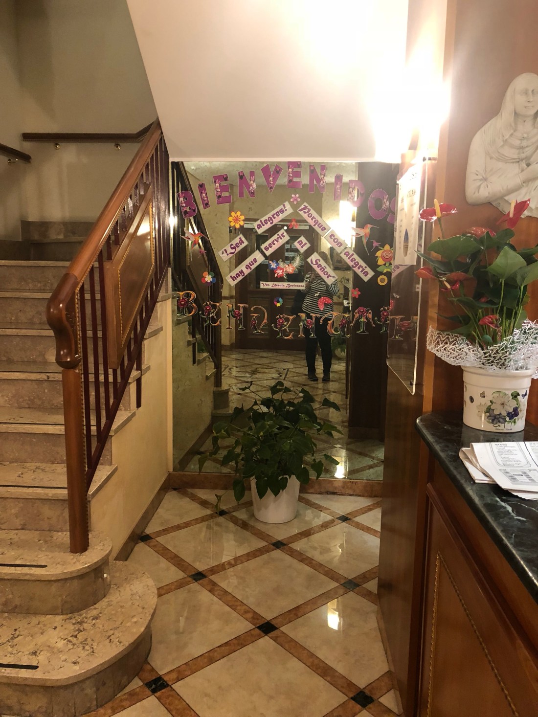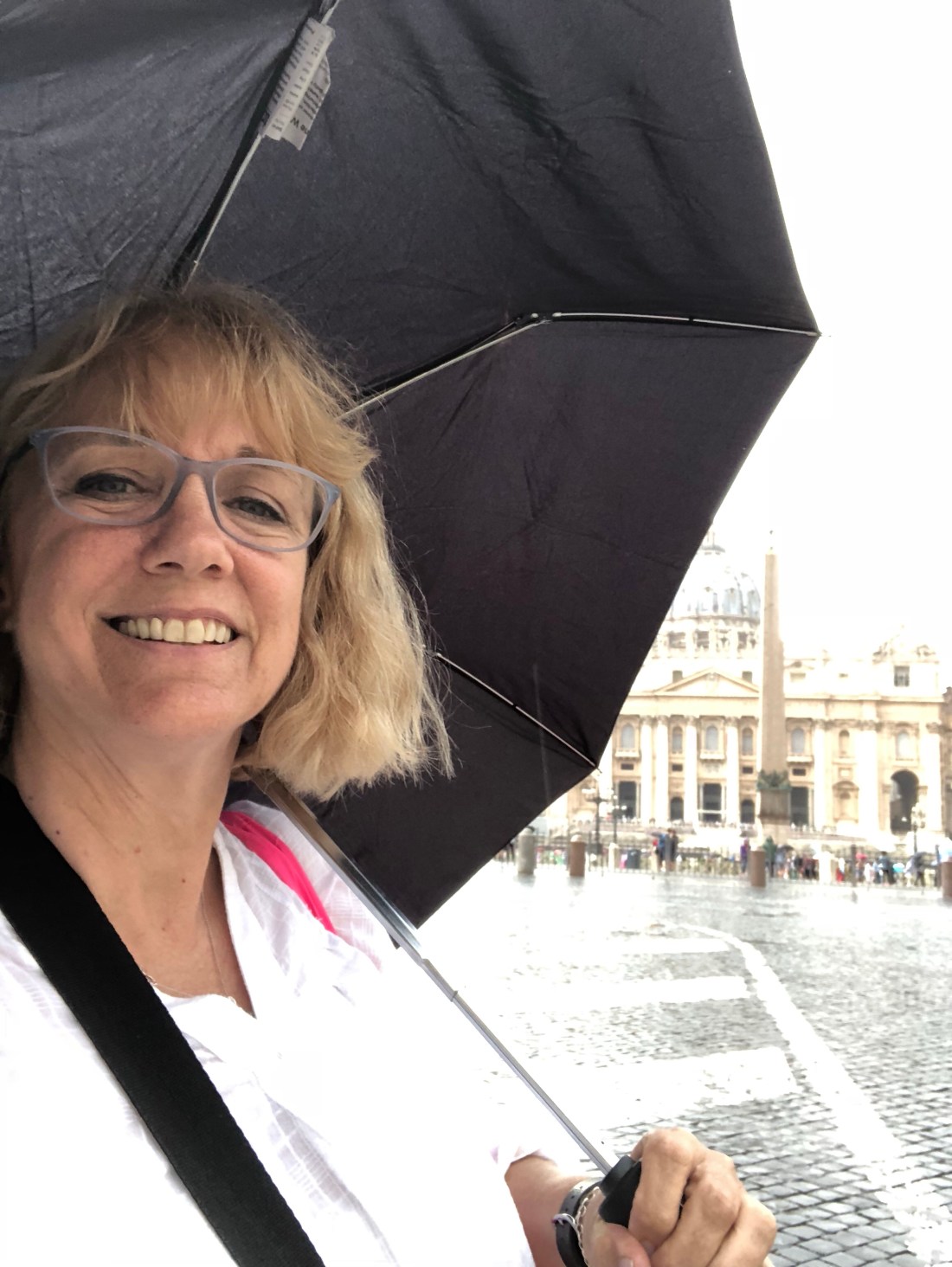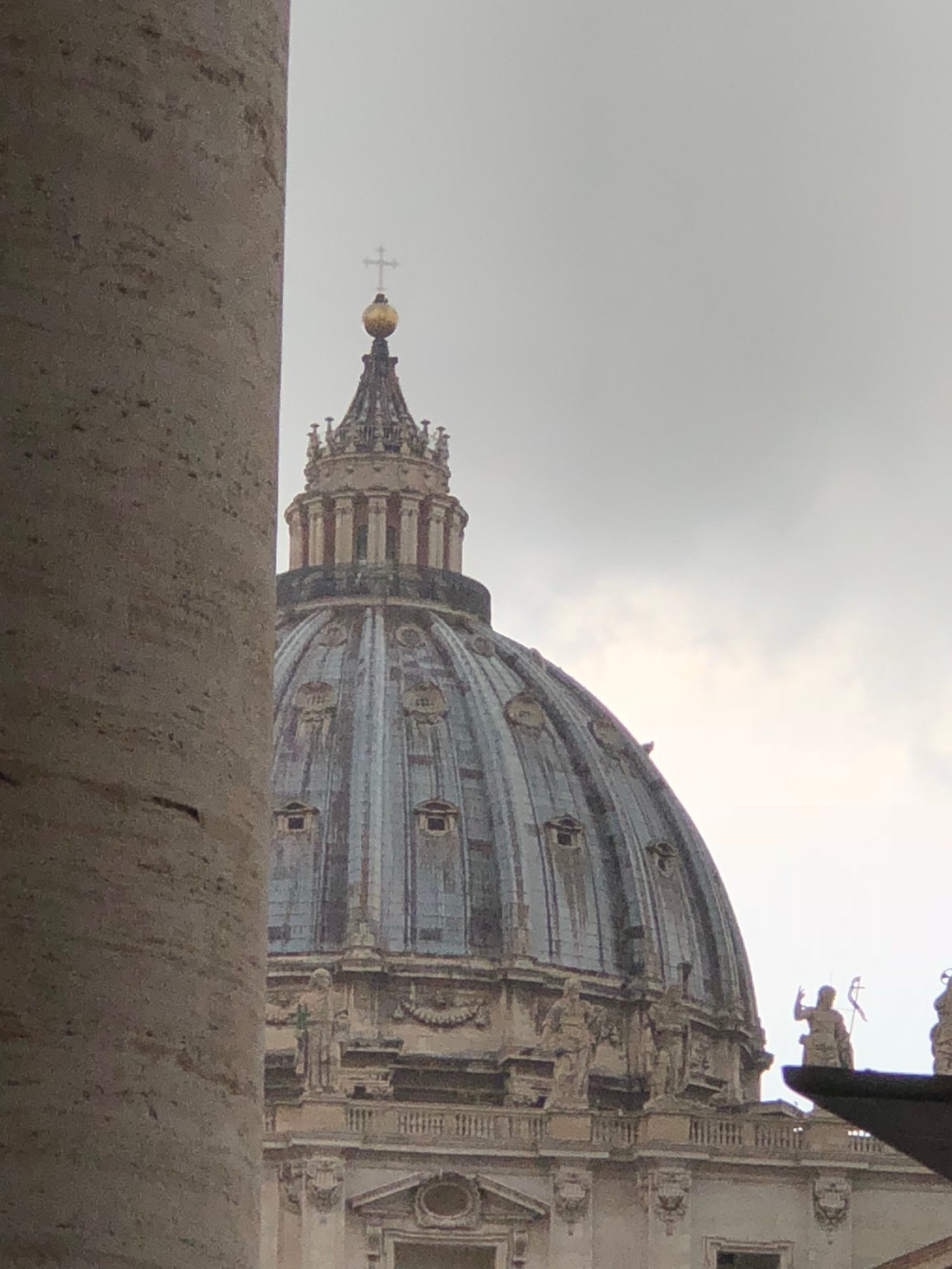 After the tour, I took the exit into the Basilica. Seeing it through adult eyes, I appreciated it more. I wandered, took my time, really looked at everything. The only thing I didn’t do was climb to the top of the dome. I left and had to get something to drink. So I took it to the area under or next to the columns that form the semicircle around the plaza. Almost as soon as I did a thunderstorm started. Strange as it sounds, I totally enjoyed it. I watched people. I watched the way the colors on the dome changed in the rain. And, I just enjoyed being there. Eventually, I left in search of a place for dinner. Lasagna was the evenings choice and then next door for a really promising looking cookie (pistachio). Wandering back to the convent, I witnessed the most incredible sunset. Sadly, the Sisters weren’t there , which made me sad. I had really wanted to say goodbye and thank them for taking such good care of me.