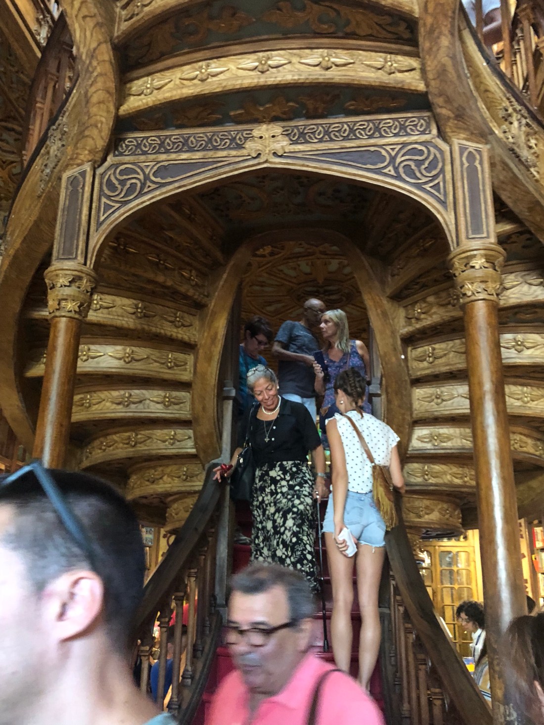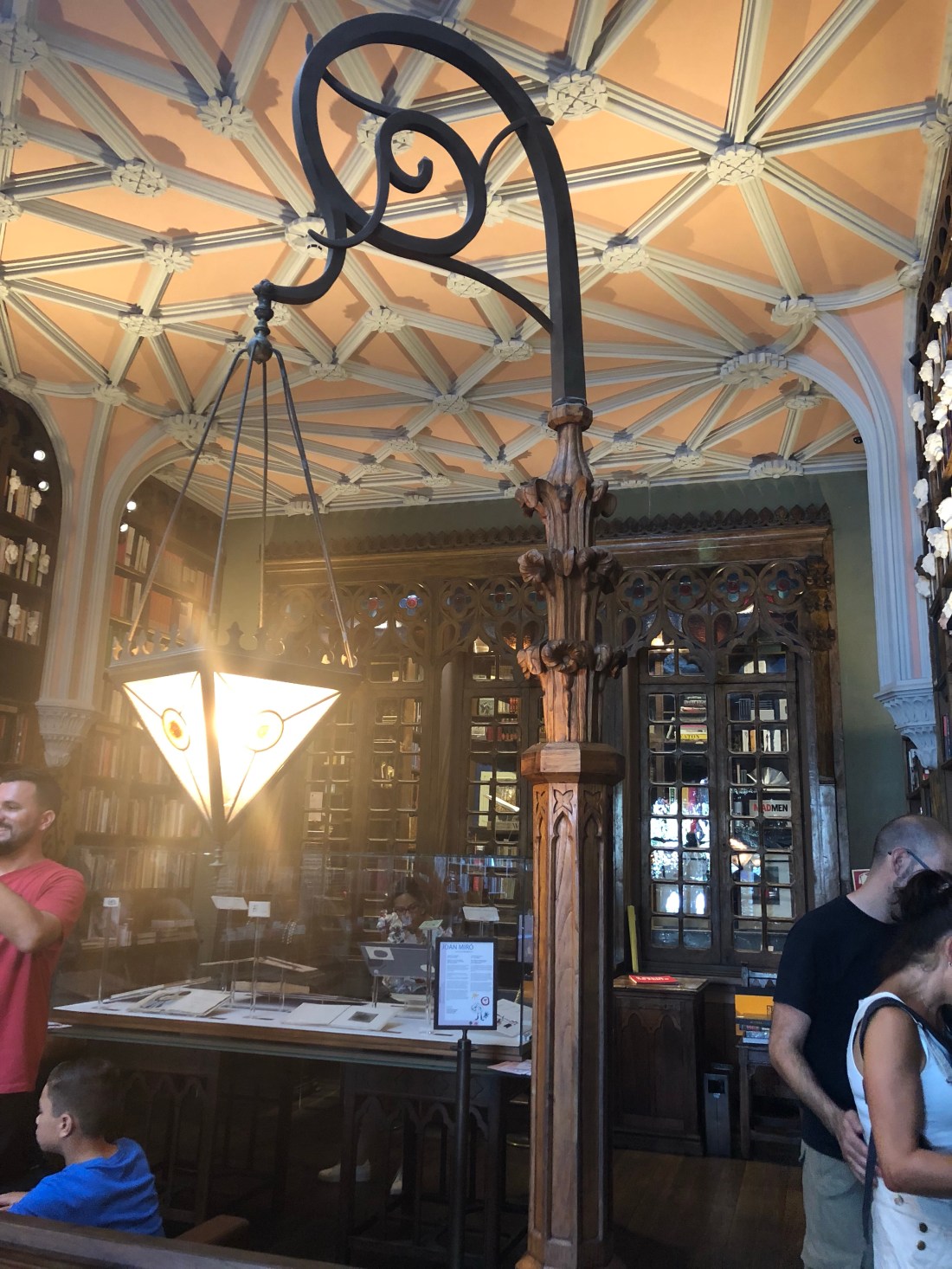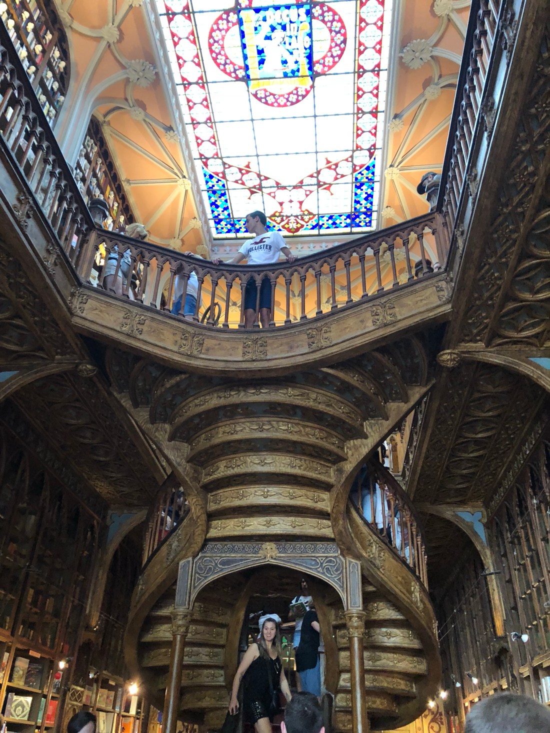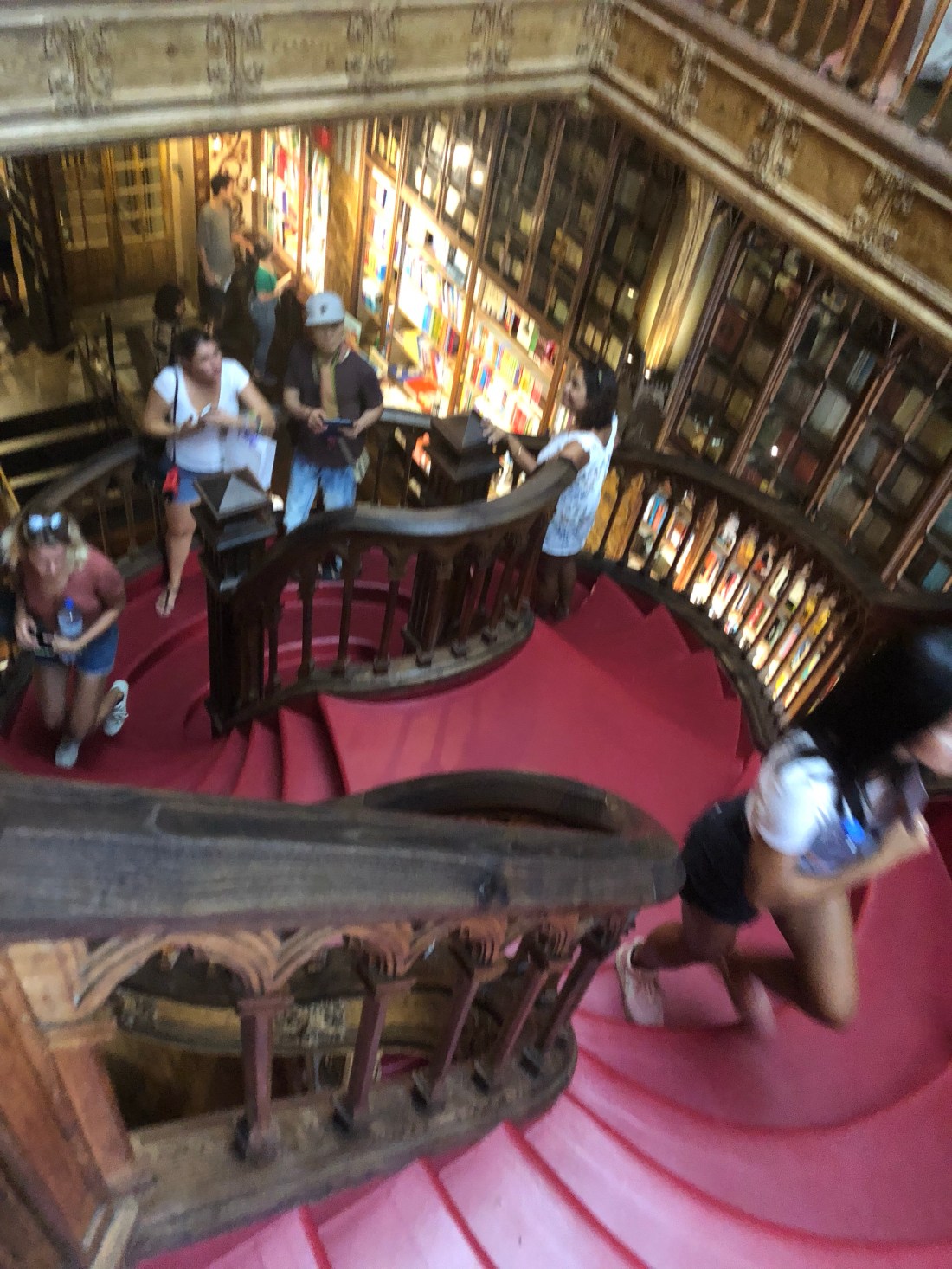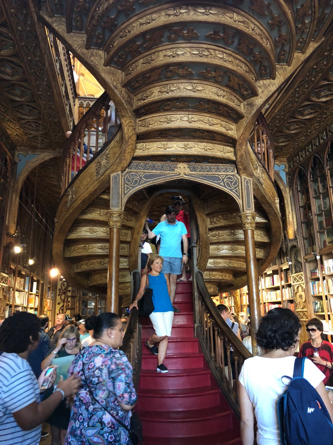 As you’ll see in the first couple pictures, I had a crazy shower…….Surround sound and a bunch of jets. Ok, it was a little bizarre, but good bizarre. It was a nice way to start the day. The hotel provided a light breakfast and then we were off. We rode the trolley/tram over to where the Lello bookstore was, but we were distracted by the university gift shop, which had some really cool and innovative gadgets. A short walk away was Lello, which today’s visit was planned around. Enjoy the pictures, because nothing I say will come close to describing how wonderful it is. Fran bought a couple books and we were off in search of lunch. But, this time we were distracted by a favorite china shop “Bordello Pinheiro”, where I found a piece I’d been wanting since June….. St Anthony as a sardine…..it’s a thing. We ended up at a lovely Art Deco cafe sitting under the trees….having a toaster for me and a crepe for Fran. But then, a lively coffee and port macaron which was fantastic! I ran across the street for just a minute to photograph the fanciest McDonalds I’ve ever seen, complete with pastry case.