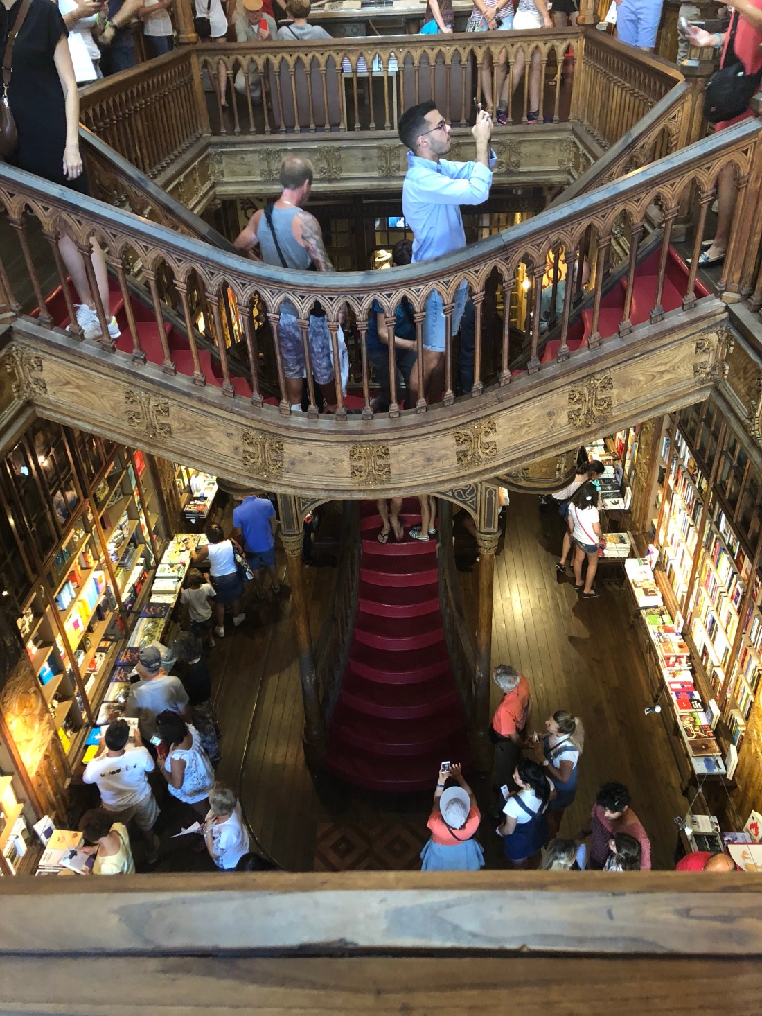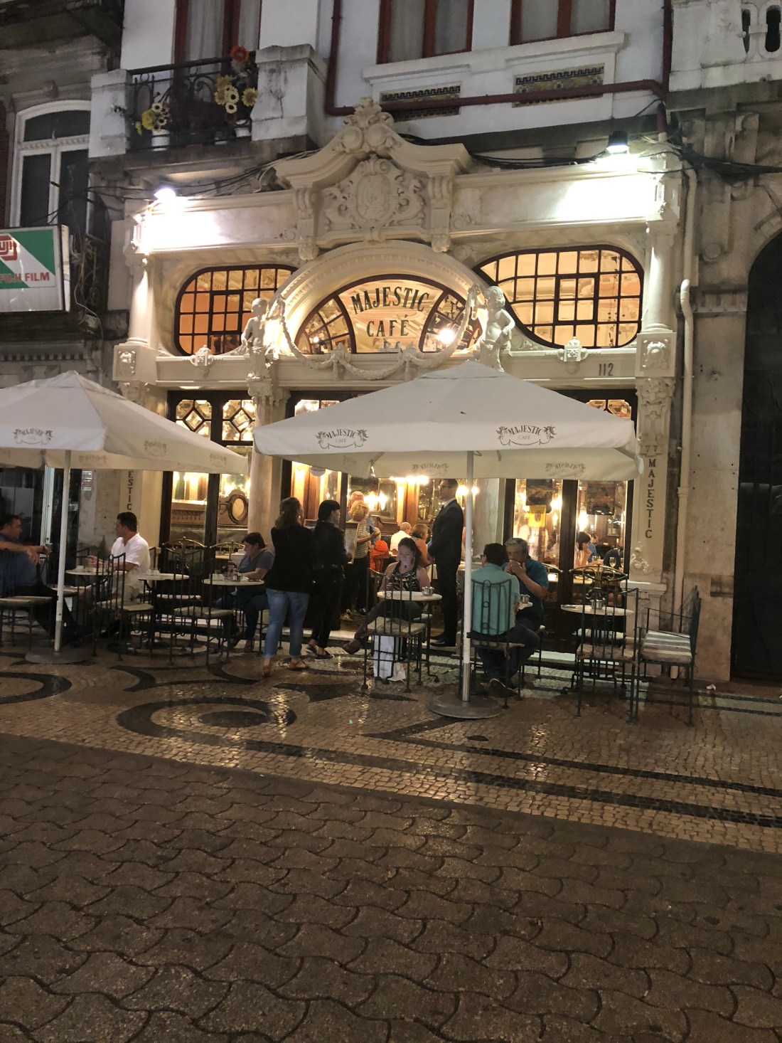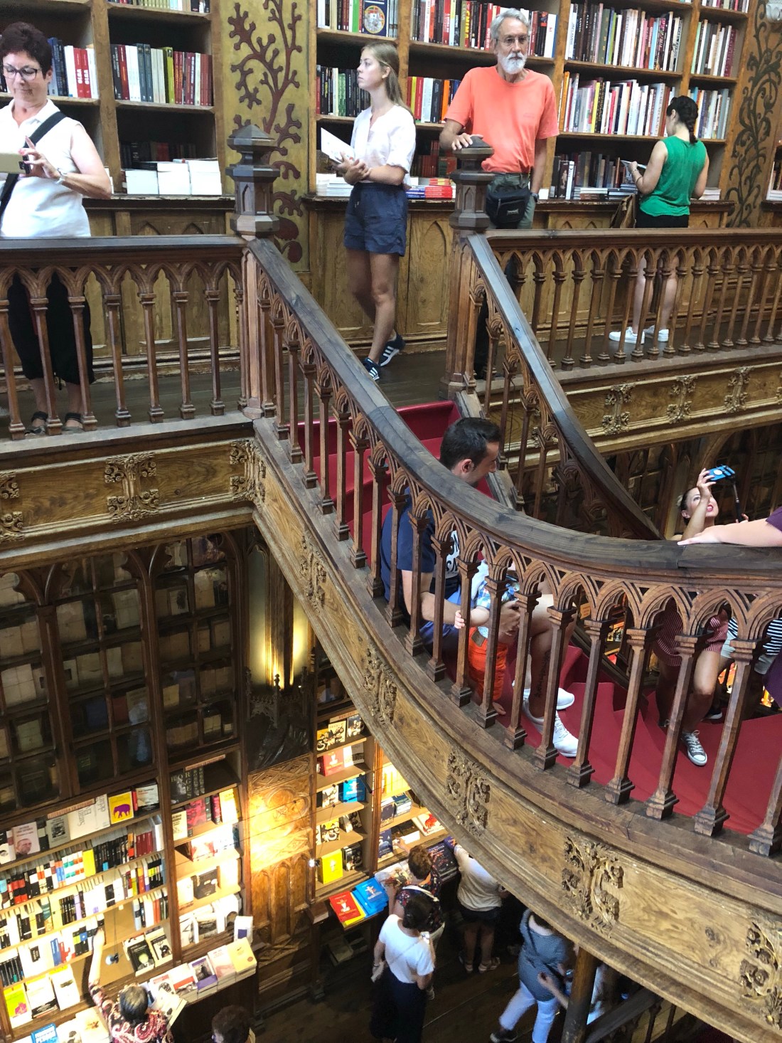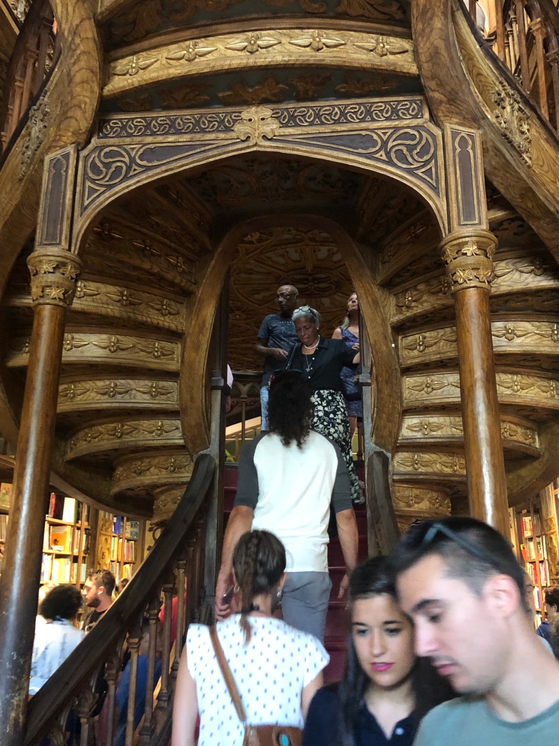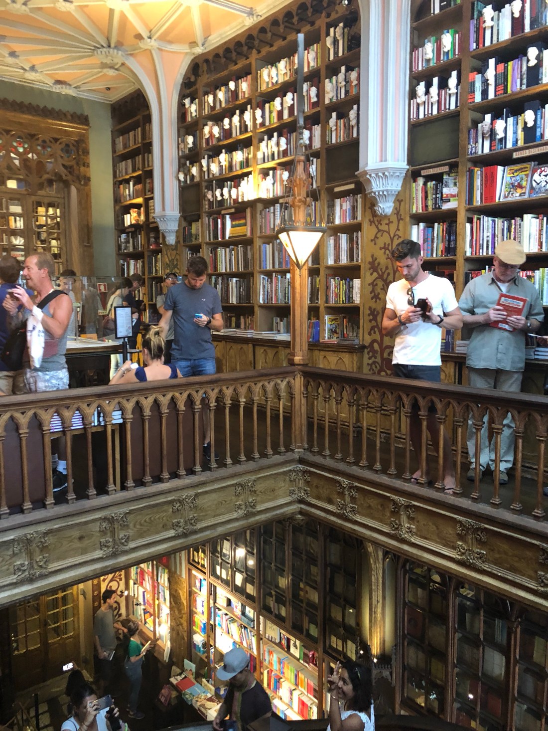 As you’ll see in the first couple pictures, I had a crazy shower…….Surround sound and a bunch of jets. Ok, it was a little bizarre, but good bizarre. It was a nice way to start the day. The hotel provided a light breakfast and then we were off. We rode the trolley/tram over to where the Lello bookstore was, but we were distracted by the university gift shop, which had some really cool and innovative gadgets. A short walk away was Lello, which today’s visit was planned around. Enjoy the pictures, because nothing I say will come close to describing how wonderful it is. Fran bought a couple books and we were off in search of lunch. But, this time we were distracted by a favorite china shop “Bordello Pinheiro”, where I found a piece I’d been wanting since June….. St Anthony as a sardine…..it’s a thing. We ended up at a lovely Art Deco cafe sitting under the trees….having a toaster for me and a crepe for Fran. But then, a lively coffee and port macaron which was fantastic! I ran across the street for just a minute to photograph the fanciest McDonalds I’ve ever seen, complete with pastry case.