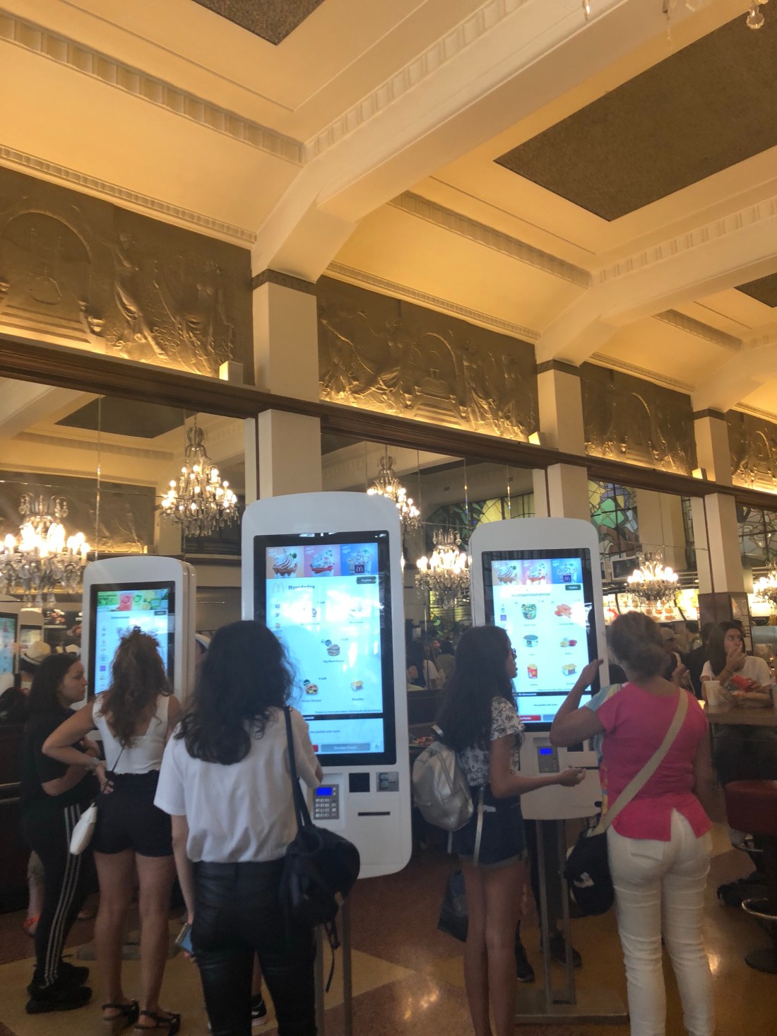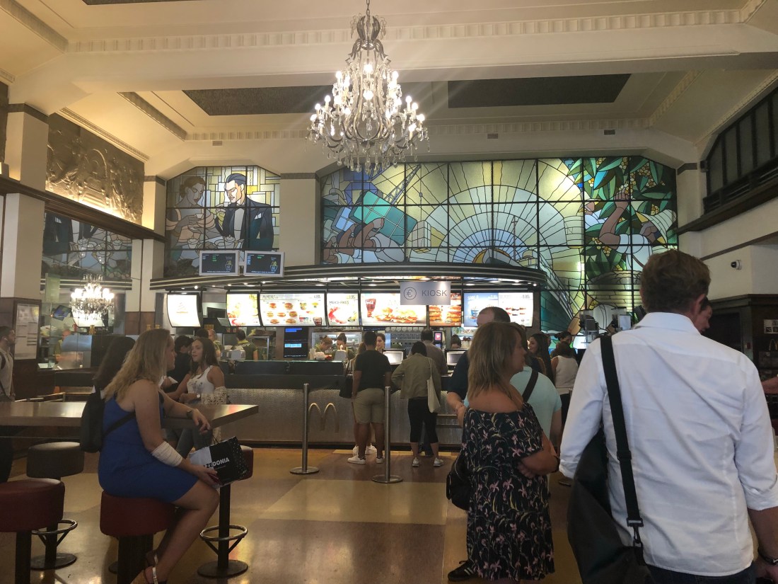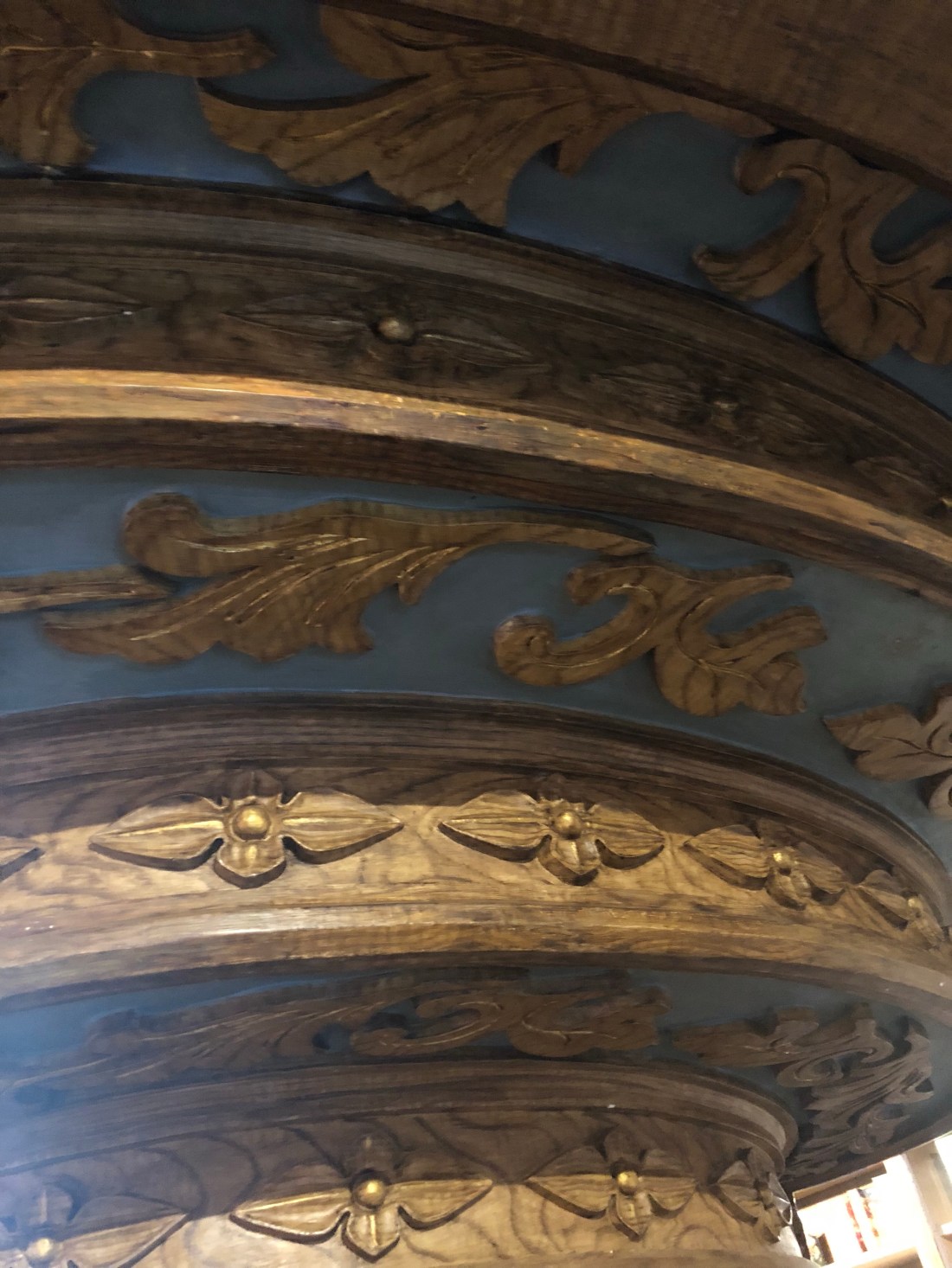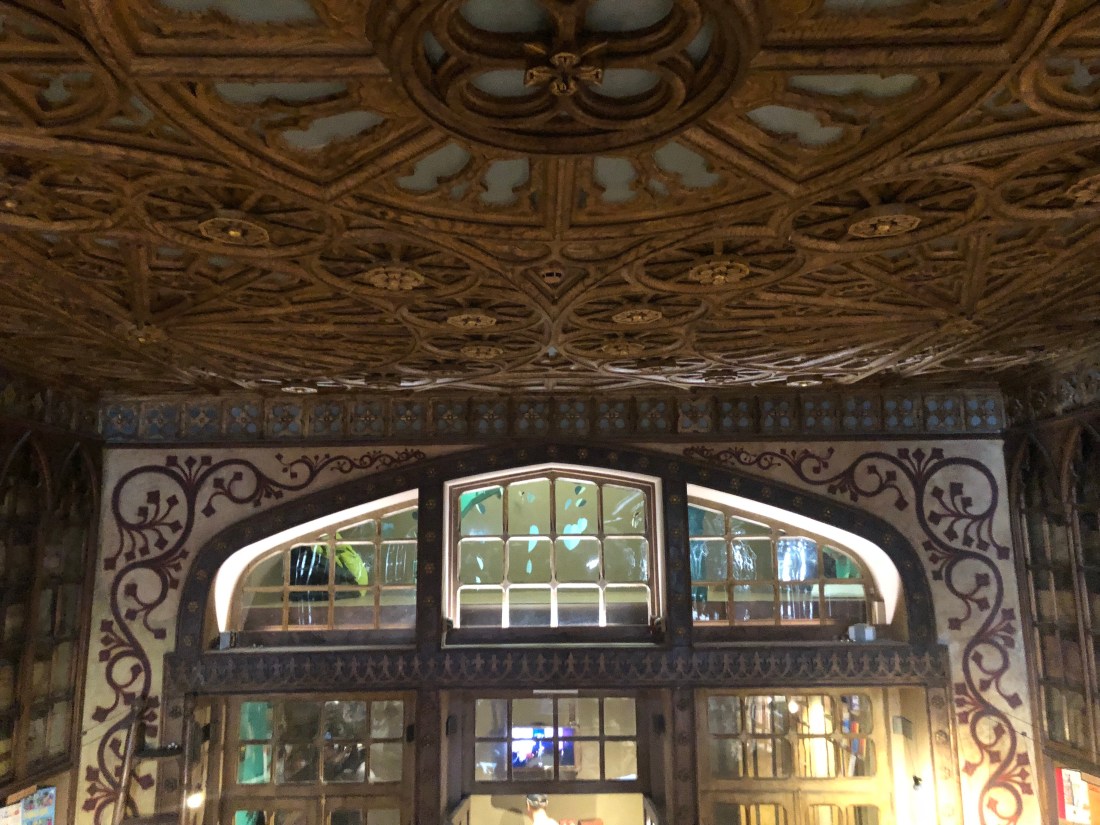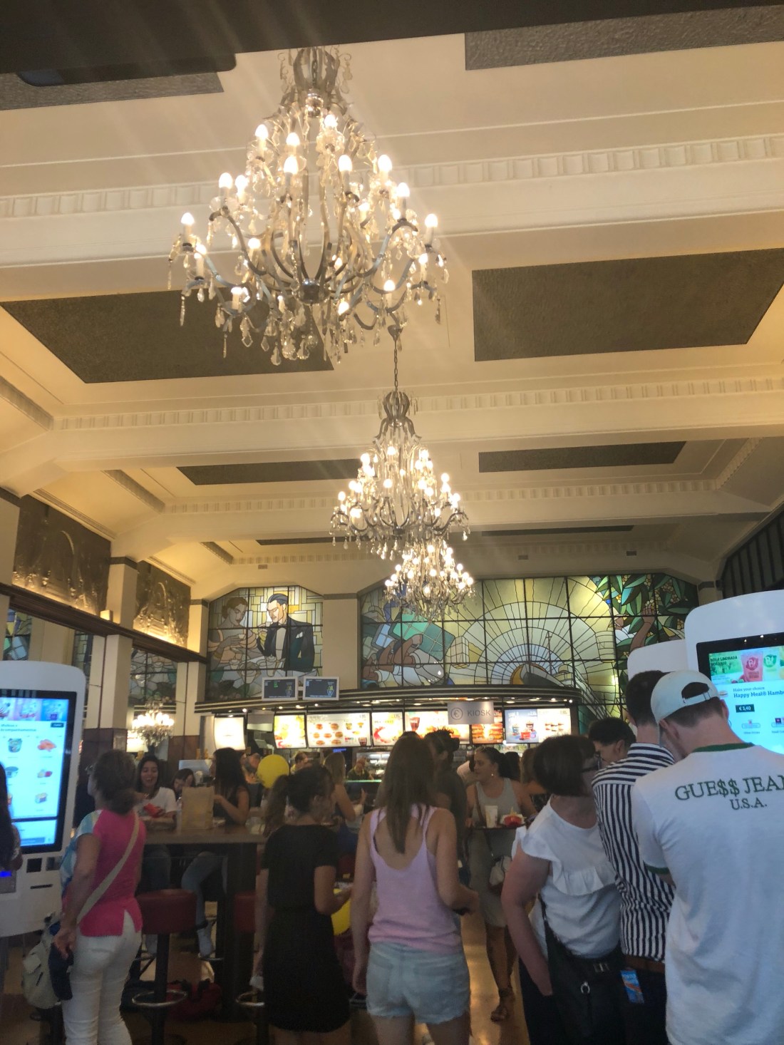 As you’ll see in the first couple pictures, I had a crazy shower…….Surround sound and a bunch of jets. Ok, it was a little bizarre, but good bizarre. It was a nice way to start the day. The hotel provided a light breakfast and then we were off. We rode the trolley/tram over to where the Lello bookstore was, but we were distracted by the university gift shop, which had some really cool and innovative gadgets. A short walk away was Lello, which today’s visit was planned around. Enjoy the pictures, because nothing I say will come close to describing how wonderful it is. Fran bought a couple books and we were off in search of lunch. But, this time we were distracted by a favorite china shop “Bordello Pinheiro”, where I found a piece I’d been wanting since June….. St Anthony as a sardine…..it’s a thing. We ended up at a lovely Art Deco cafe sitting under the trees….having a toaster for me and a crepe for Fran. But then, a lively coffee and port macaron which was fantastic! I ran across the street for just a minute to photograph the fanciest McDonalds I’ve ever seen, complete with pastry case.