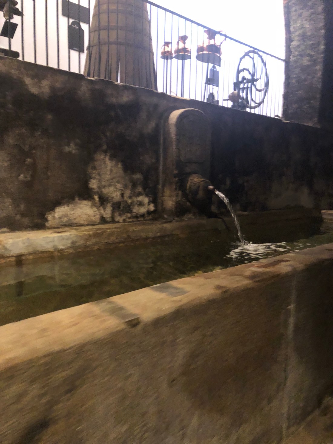 For my last evening in Lourdes I went shopping and then for a nice dinner of roast chicken and mushroom risotto. When dinner was finished, I went back to the Grotto for pictures. Below are pictures of the place where you fill your bottles with the spring water and the grotto and spring. It is tradition to touch the rock face and there are places it is worn smooth.